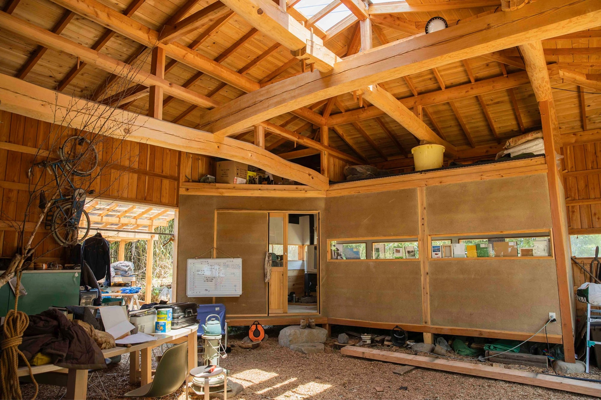 At its heart lies the “Idea Cave” — a cozy enclosed room where straw-mixed earthen walls and a wood-burning stove maintain a gentle, breathable atmosphere.